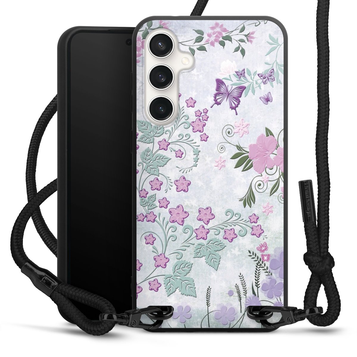 Pure Black: Handyhülle, Stoffband und Metalldetails in stylischem Mattschwarz.
