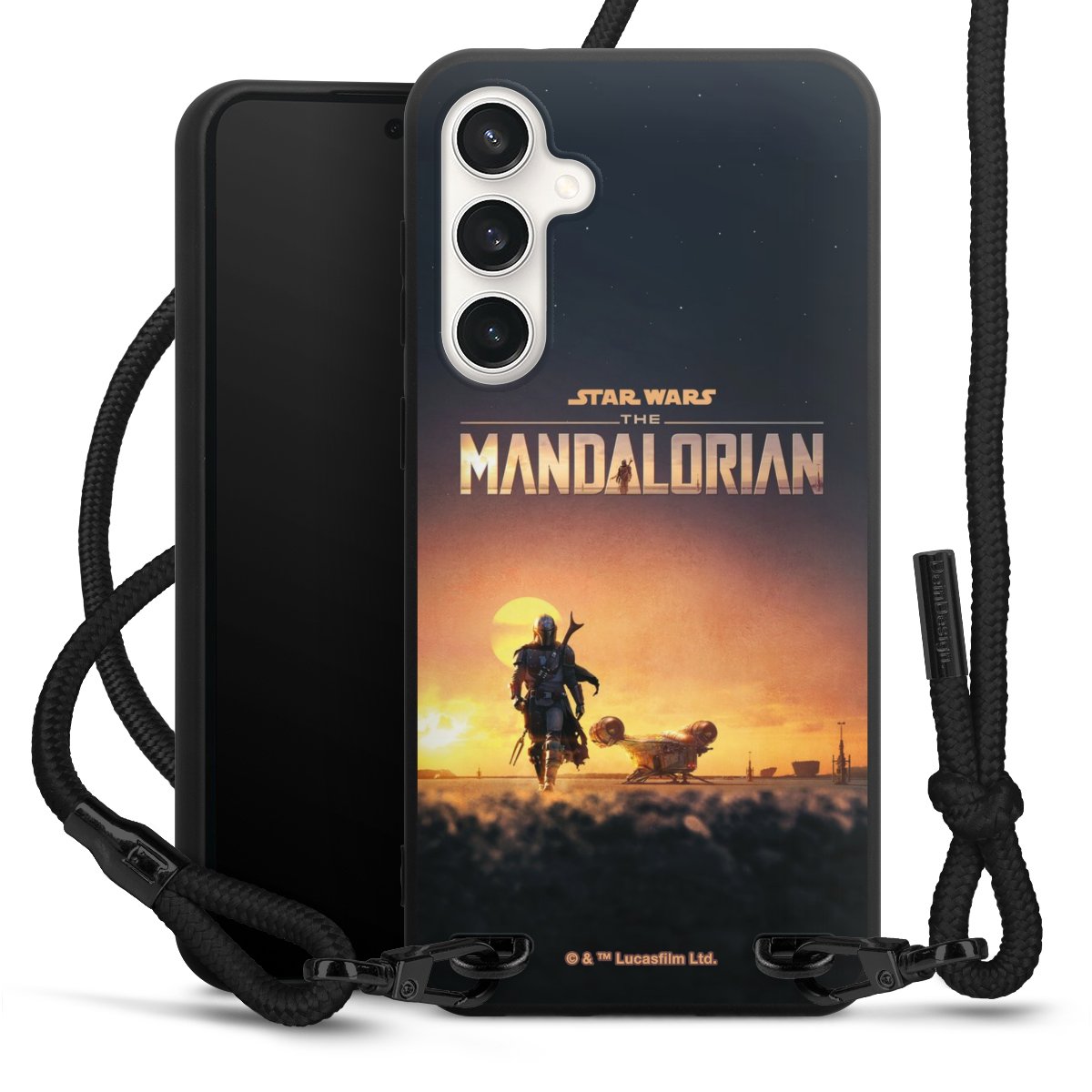 Pure Black: Handyhülle, Stoffband und Metalldetails in stylischem Mattschwarz.