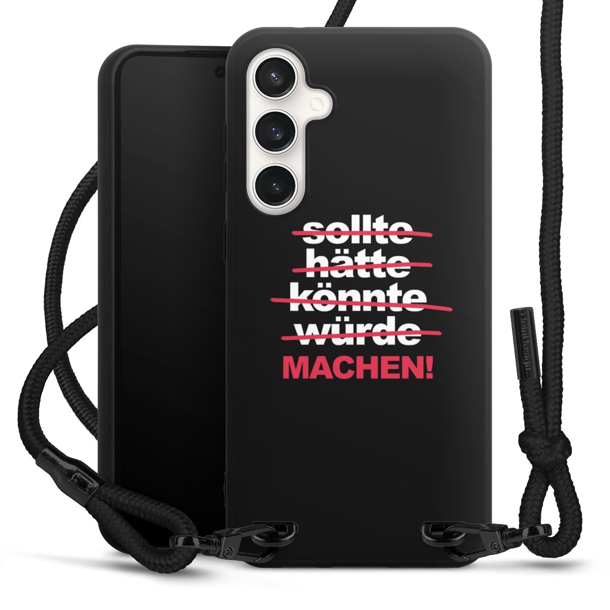 Pure Black: Handyhülle, Stoffband und Metalldetails in stylischem Mattschwarz.