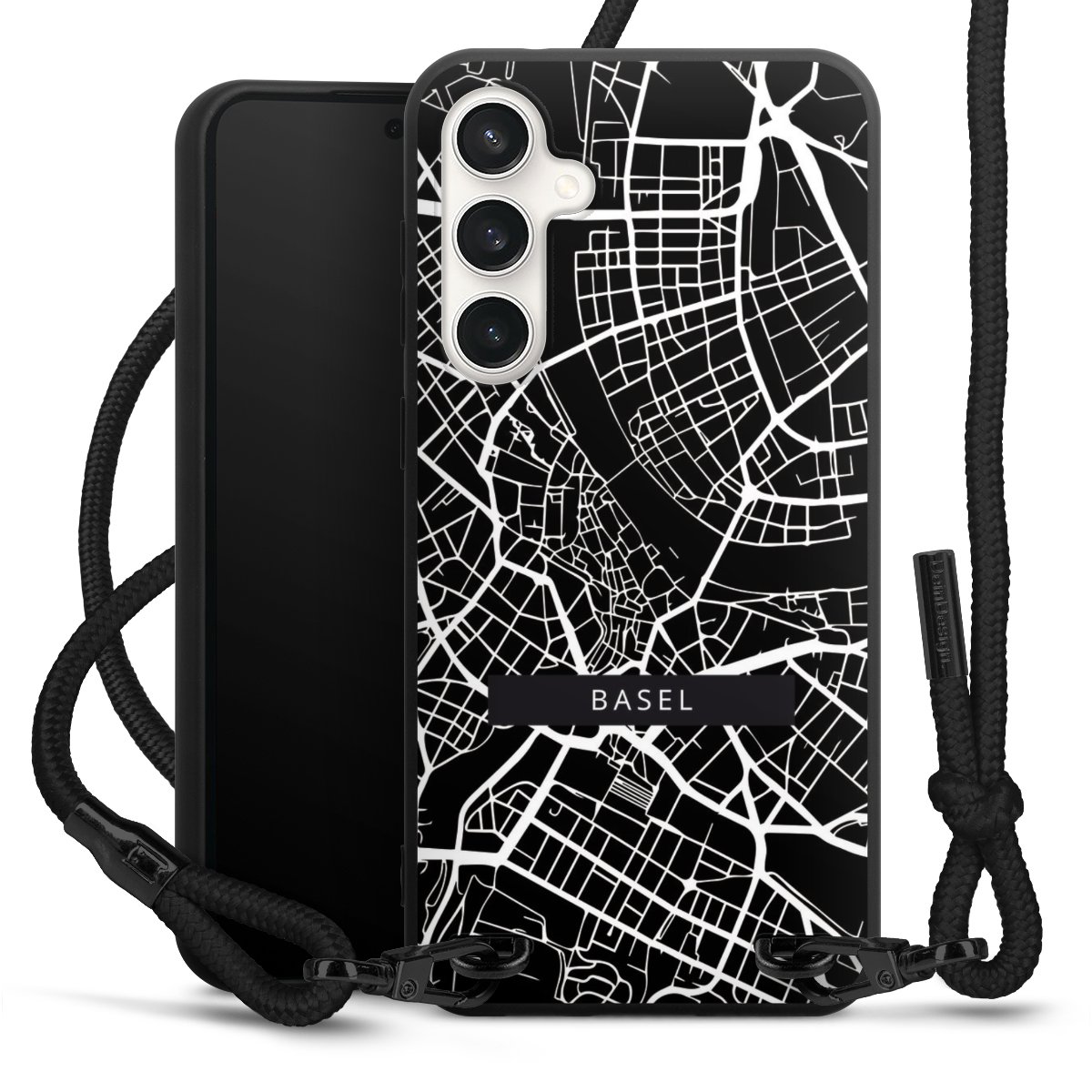 Pure Black: Handyhülle, Stoffband und Metalldetails in stylischem Mattschwarz.