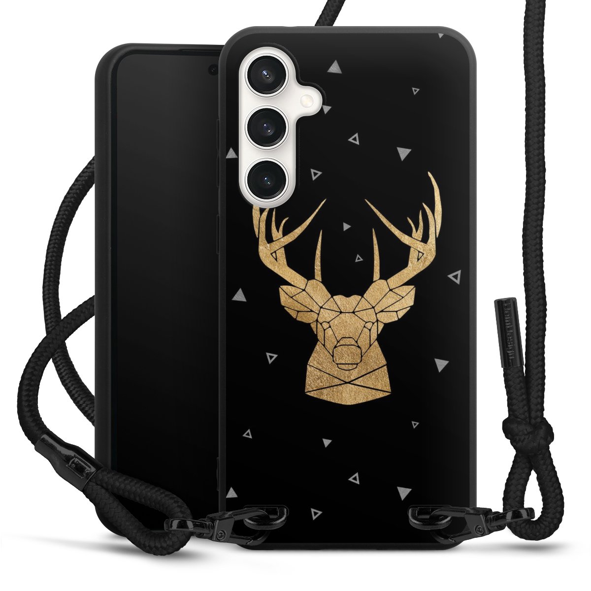 Pure Black: Handyhülle, Stoffband und Metalldetails in stylischem Mattschwarz.
