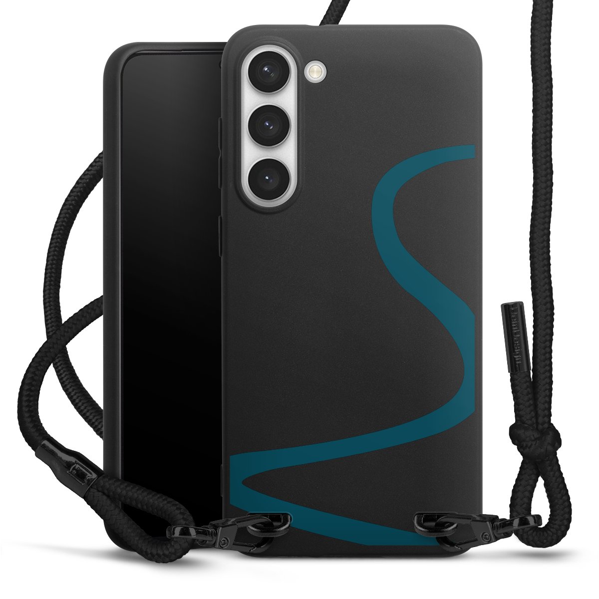 Pure Black: Handyhülle, Stoffband und Metalldetails in stylischem Mattschwarz.