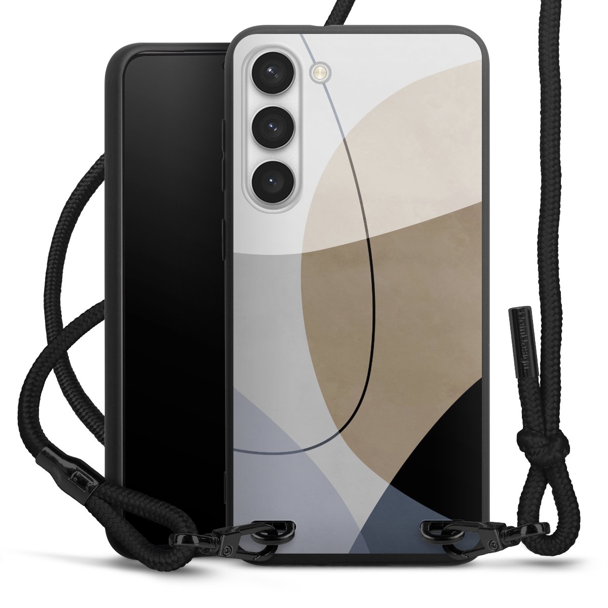 Pure Black: Handyhülle, Stoffband und Metalldetails in stylischem Mattschwarz.
