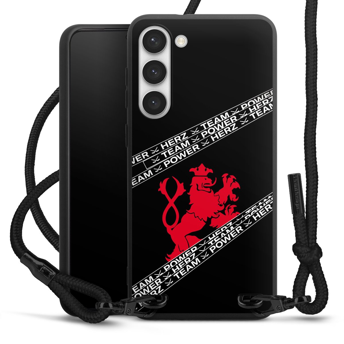 Pure Black: Handyhülle, Stoffband und Metalldetails in stylischem Mattschwarz.