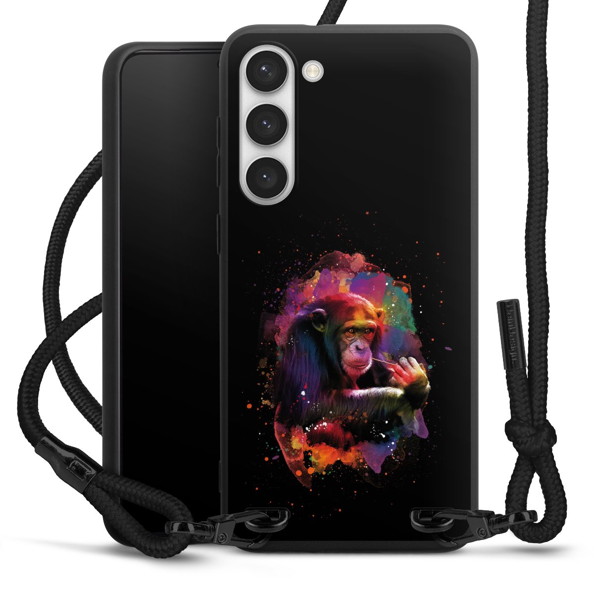 Pure Black: Handyhülle, Stoffband und Metalldetails in stylischem Mattschwarz.