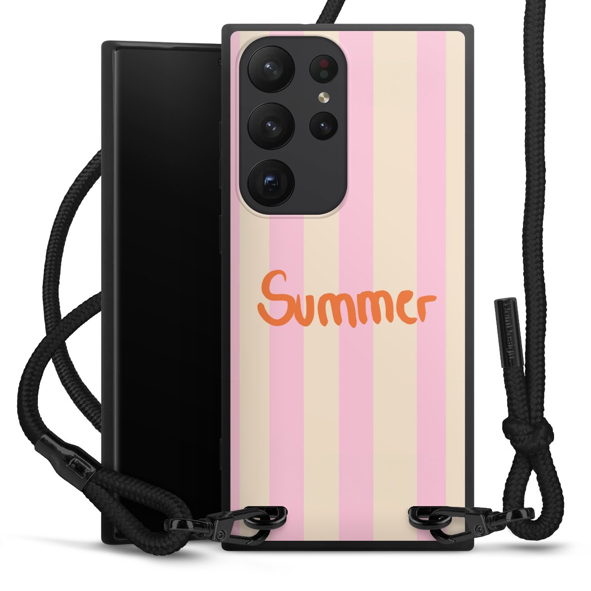 Pure Black: Handyhülle, Stoffband und Metalldetails in stylischem Mattschwarz.