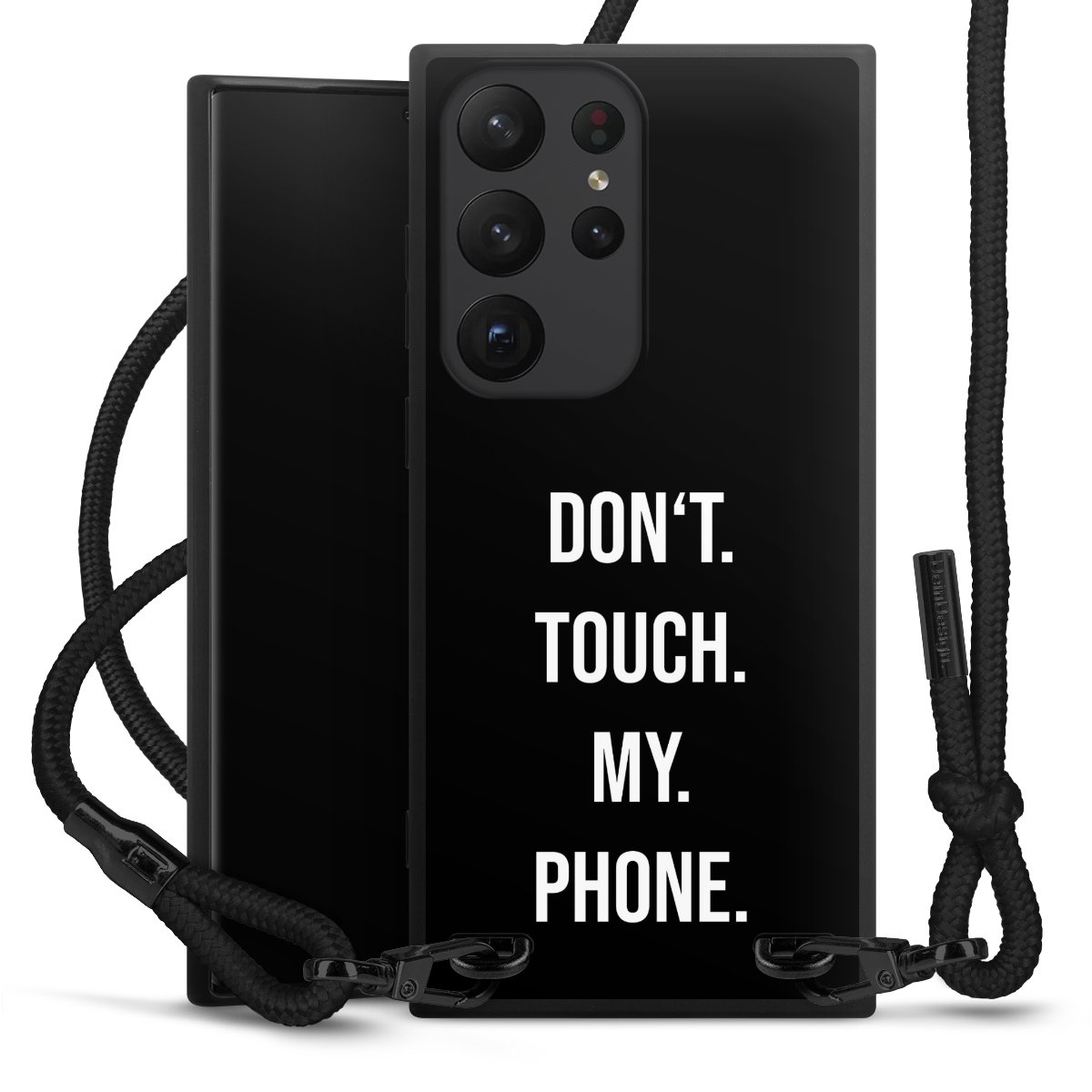 Pure Black: Handyhülle, Stoffband und Metalldetails in stylischem Mattschwarz.