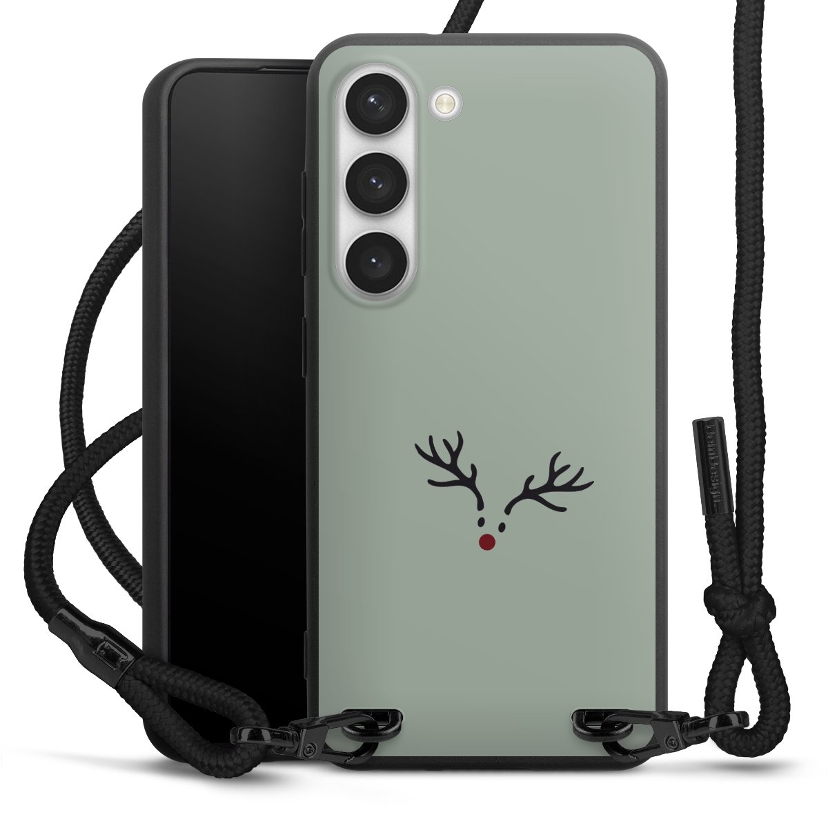 Pure Black: Handyhülle, Stoffband und Metalldetails in stylischem Mattschwarz.