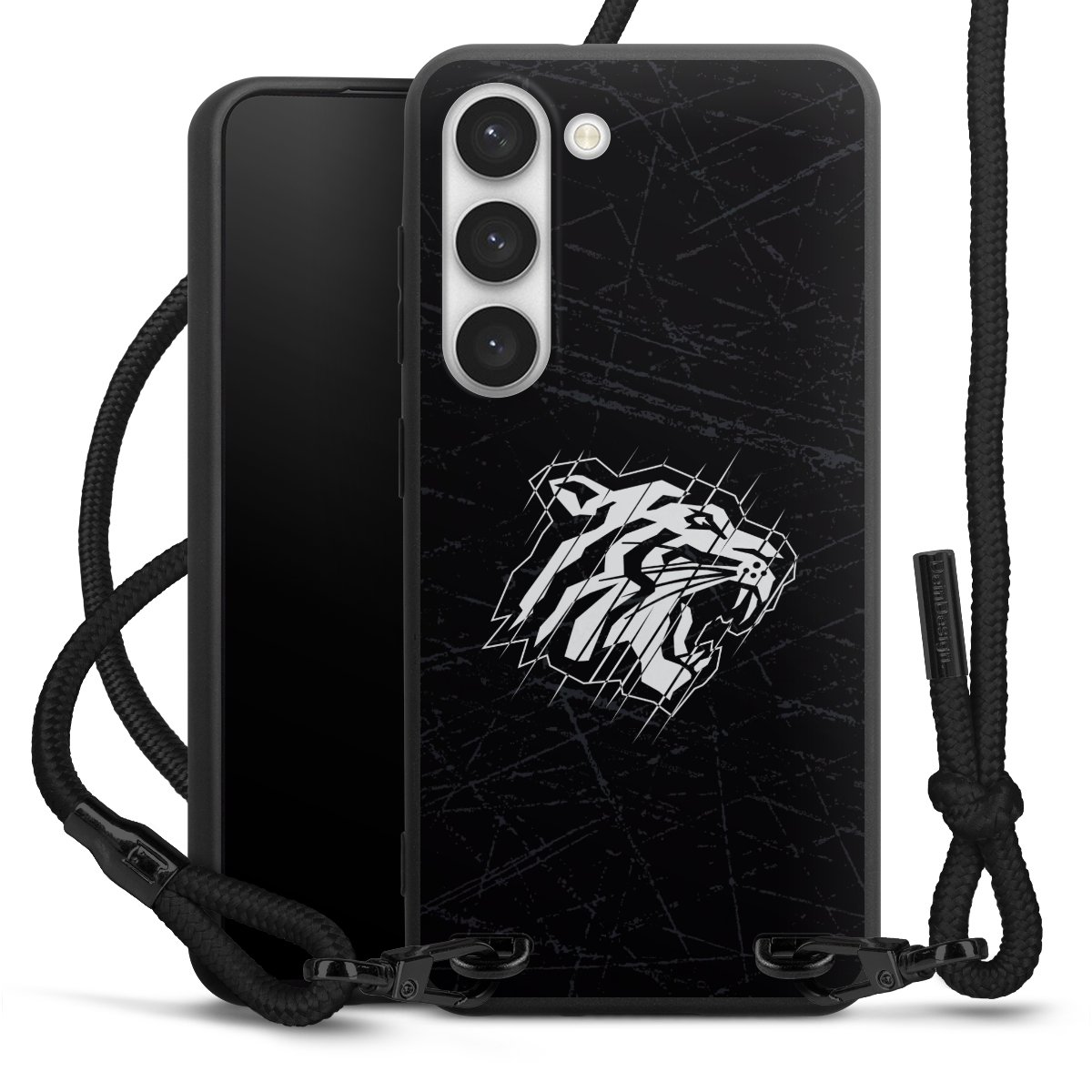 Pure Black: Handyhülle, Stoffband und Metalldetails in stylischem Mattschwarz.