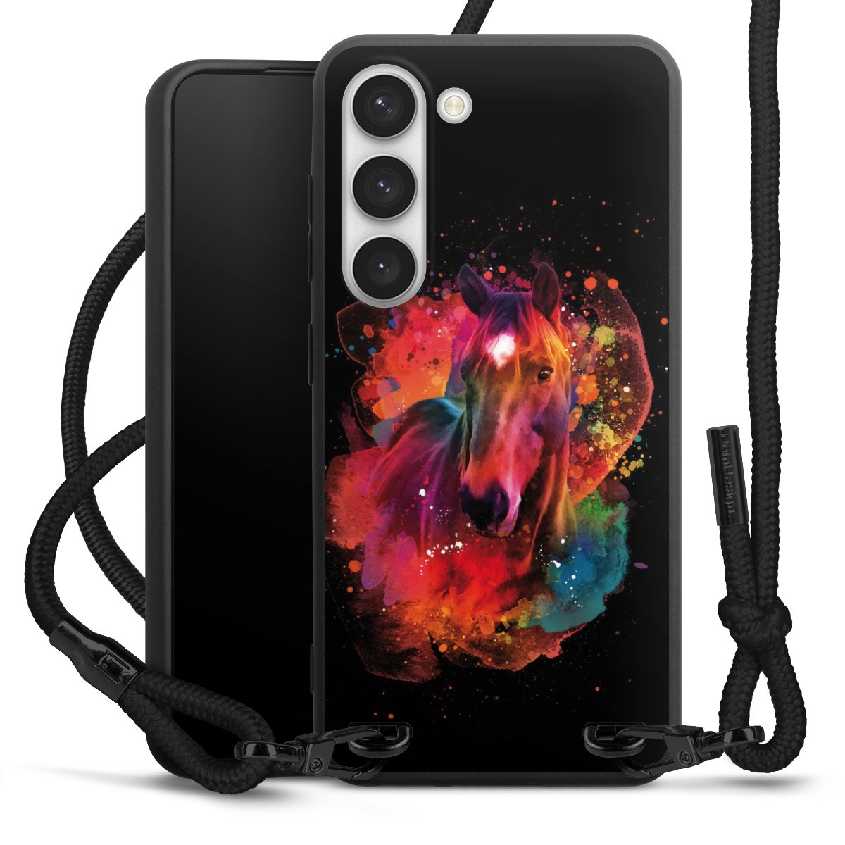 Pure Black: Handyhülle, Stoffband und Metalldetails in stylischem Mattschwarz.