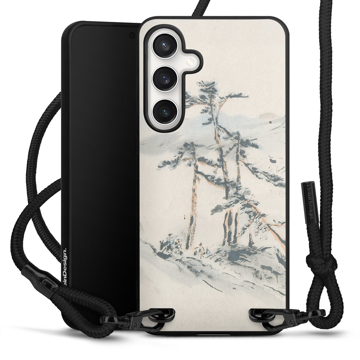 Pure Black: Handyhülle, Stoffband und Metalldetails in stylischem Mattschwarz.