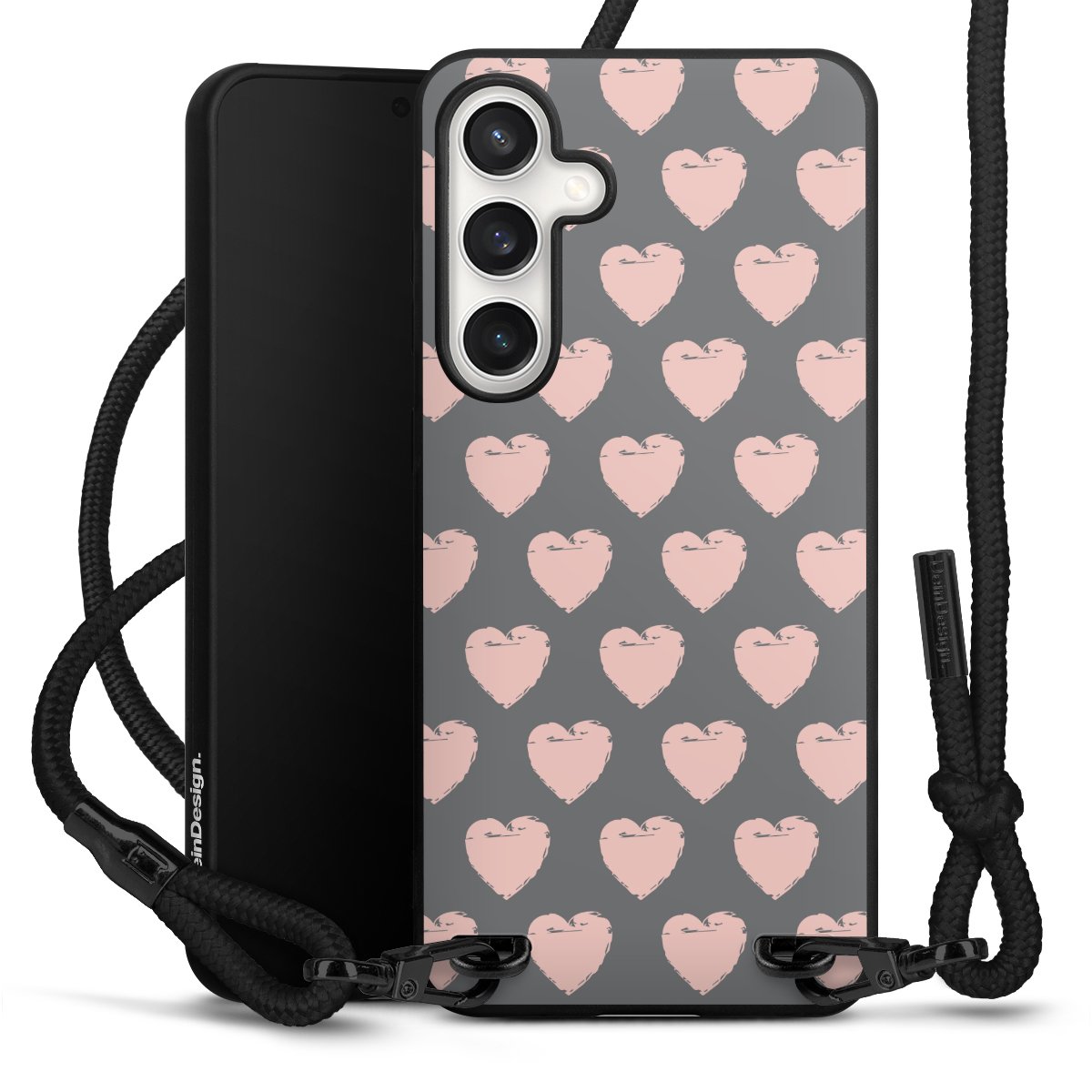 Pure Black: Handyhülle, Stoffband und Metalldetails in stylischem Mattschwarz.