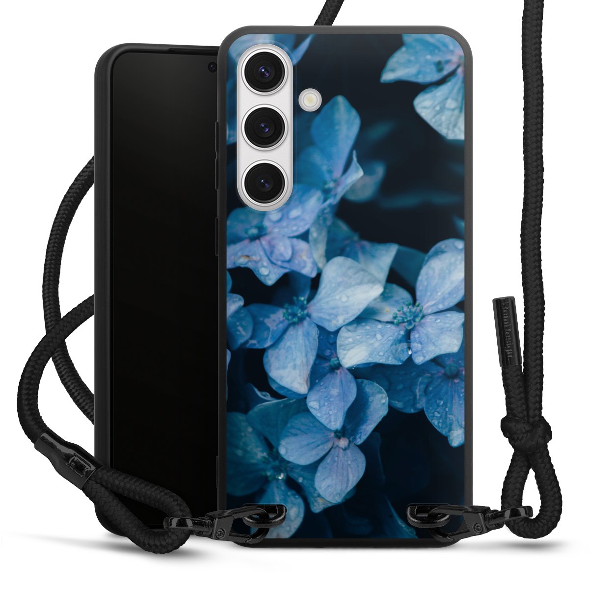 Pure Black: Handyhülle, Stoffband und Metalldetails in stylischem Mattschwarz.