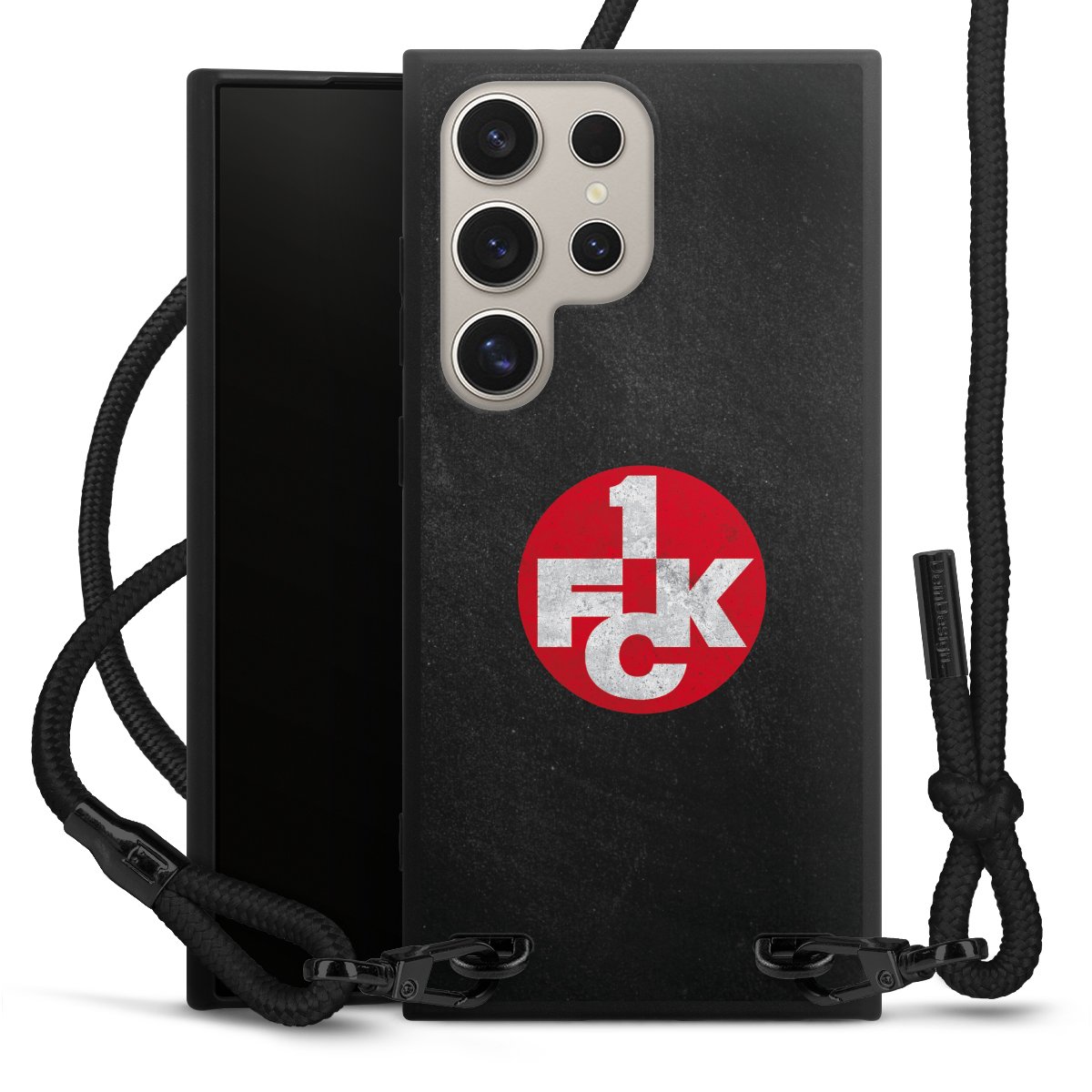 Pure Black: Handyhülle, Stoffband und Metalldetails in stylischem Mattschwarz.