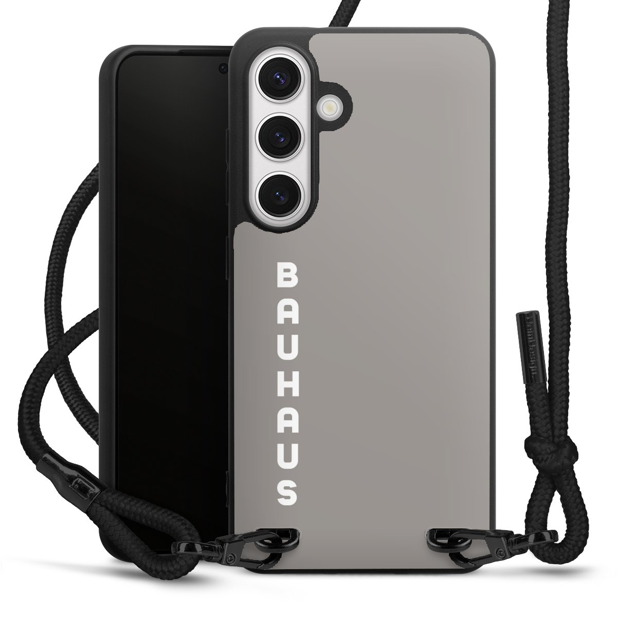 Pure Black: Handyhülle, Stoffband und Metalldetails in stylischem Mattschwarz.