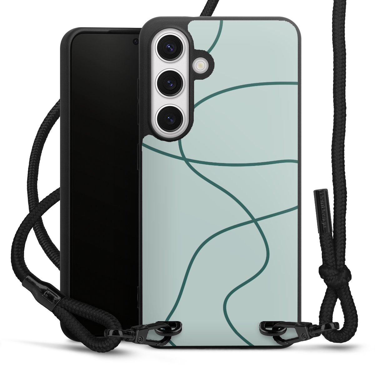 Pure Black: Handyhülle, Stoffband und Metalldetails in stylischem Mattschwarz.