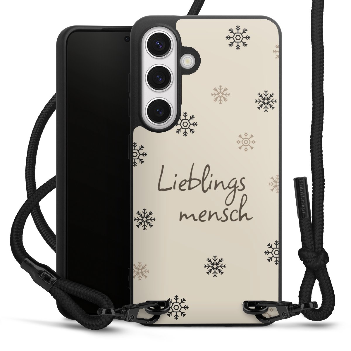 Pure Black: Handyhülle, Stoffband und Metalldetails in stylischem Mattschwarz.