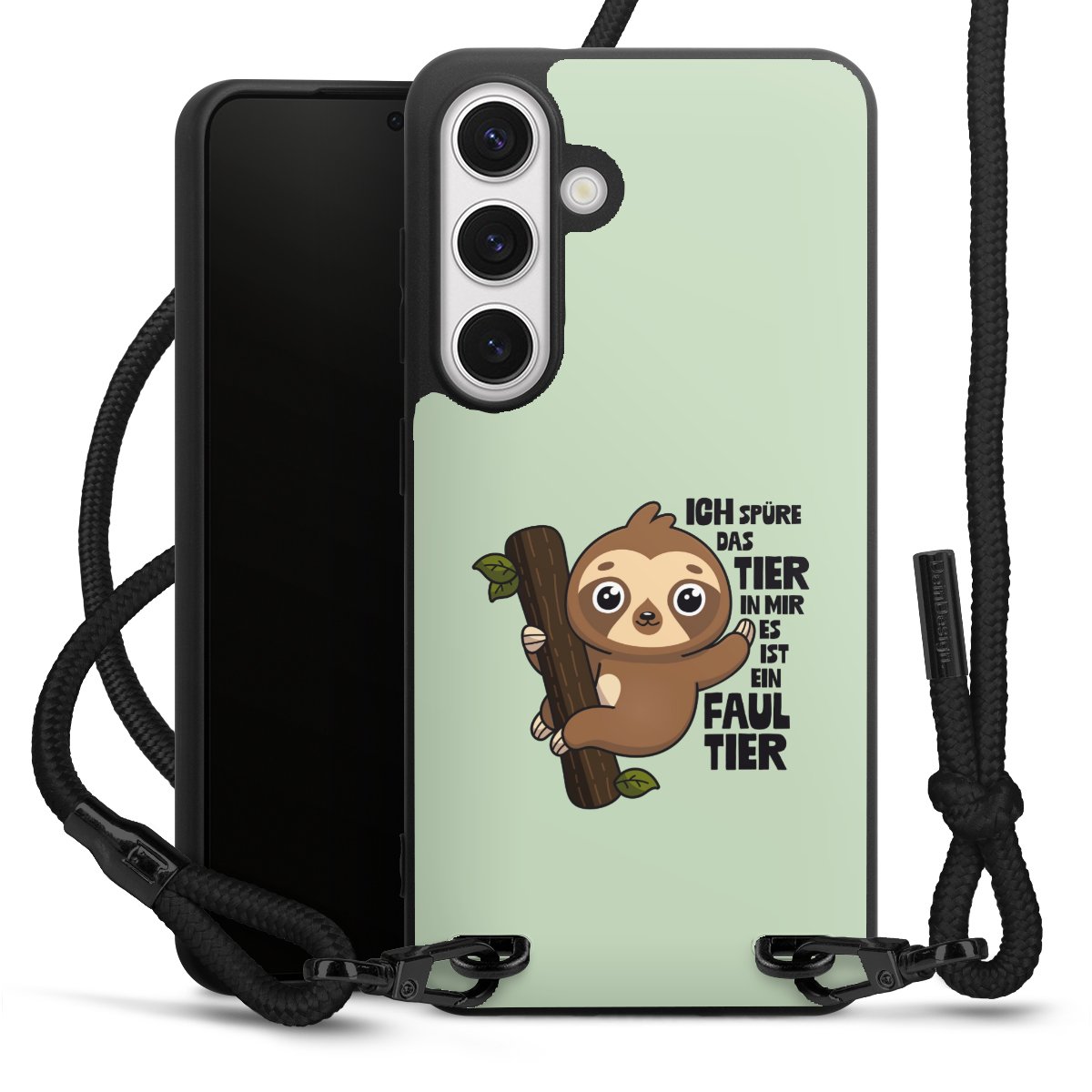 Pure Black: Handyhülle, Stoffband und Metalldetails in stylischem Mattschwarz.