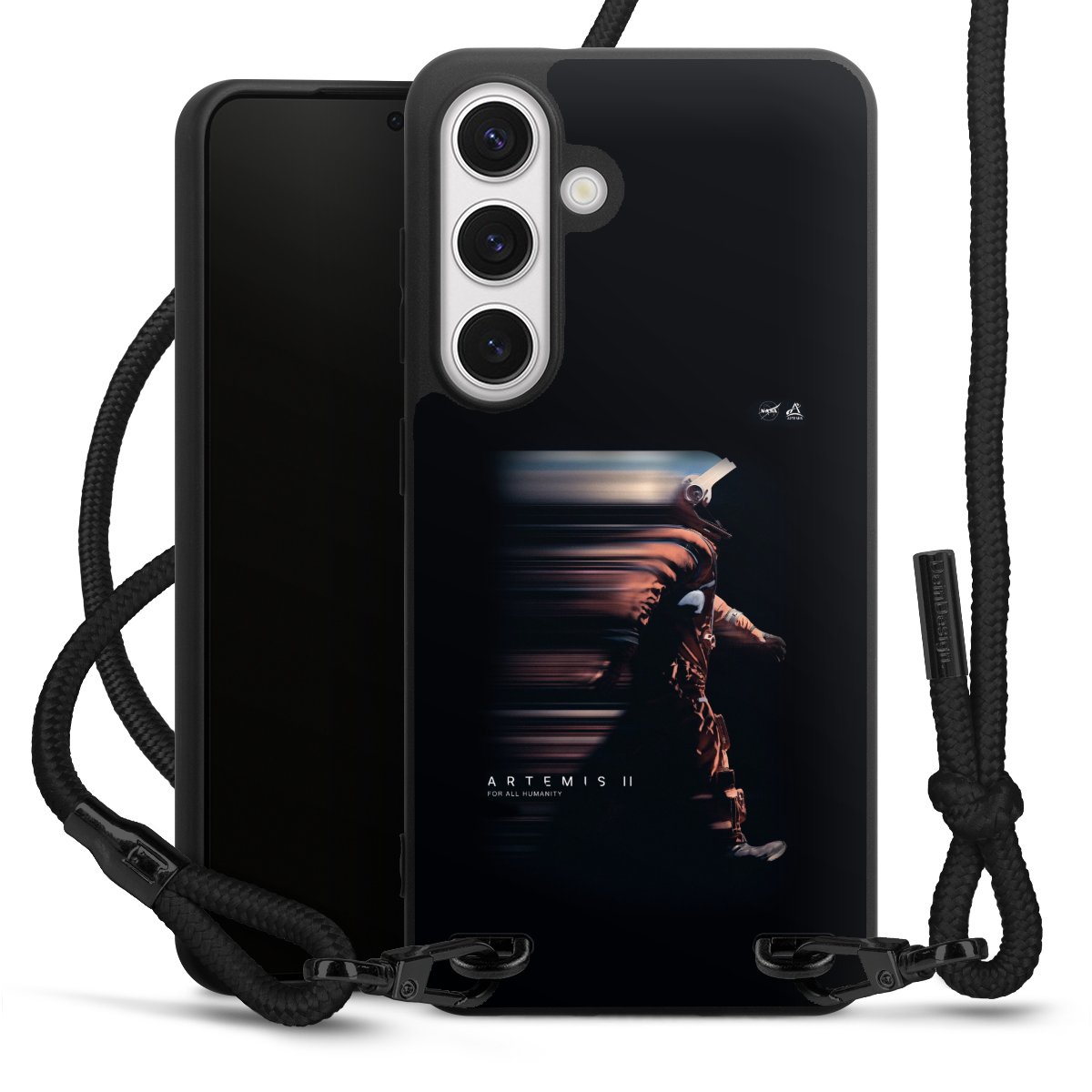 Pure Black: Handyhülle, Stoffband und Metalldetails in stylischem Mattschwarz.