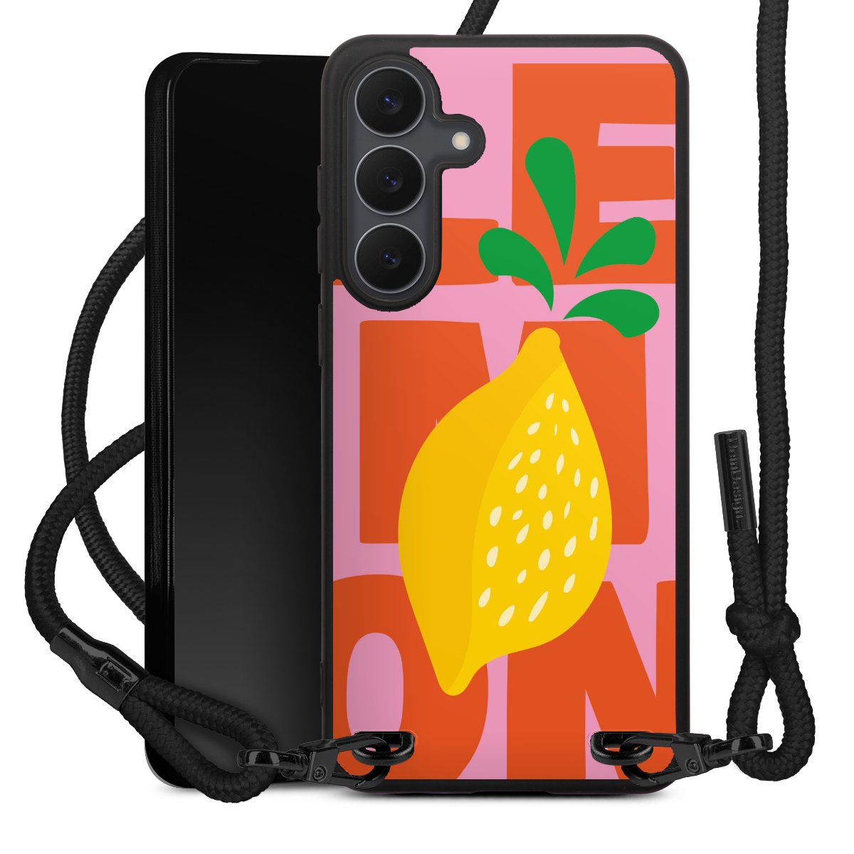 Pure Black: Handyhülle, Stoffband und Metalldetails in stylischem Mattschwarz.