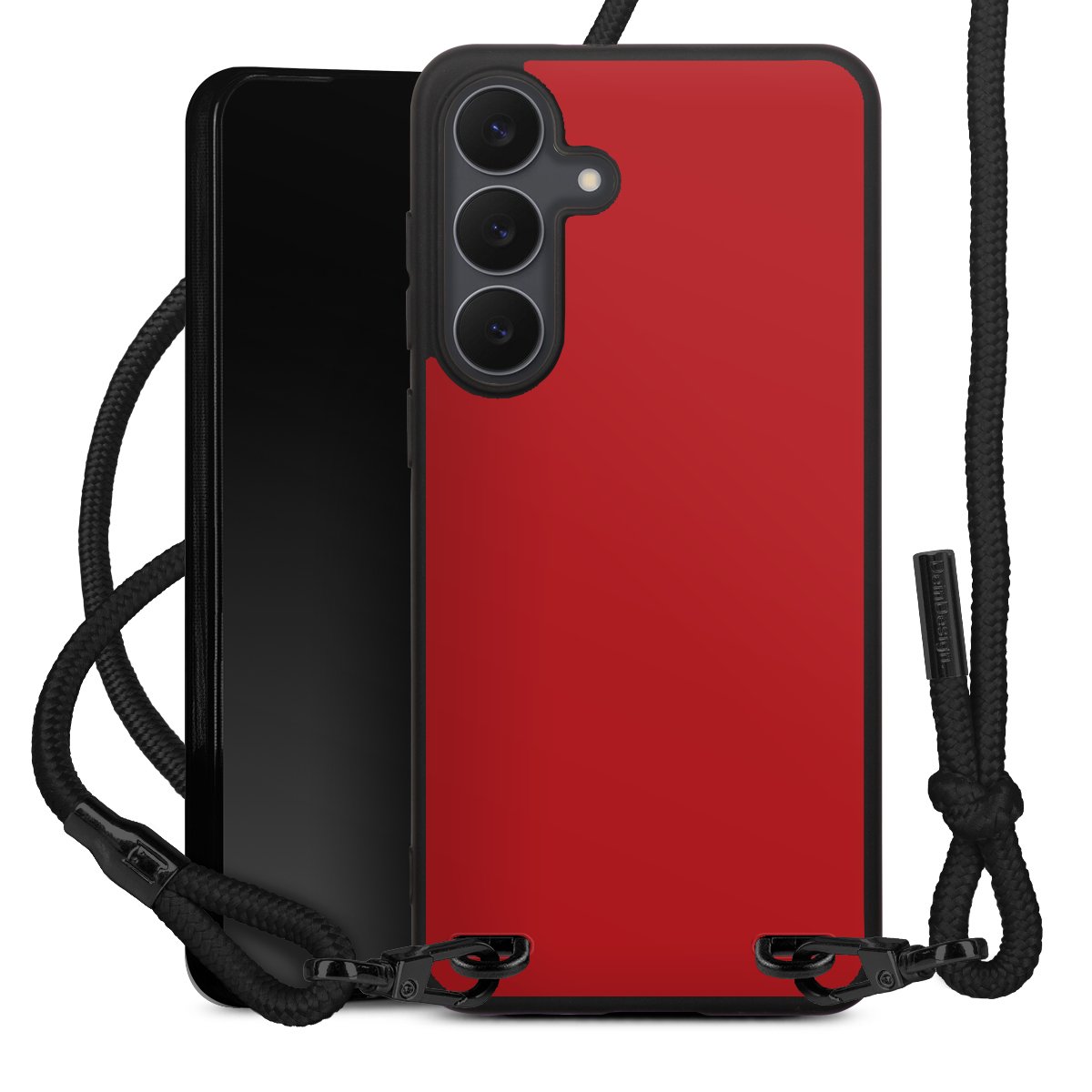 Pure Black: Handyhülle, Stoffband und Metalldetails in stylischem Mattschwarz.