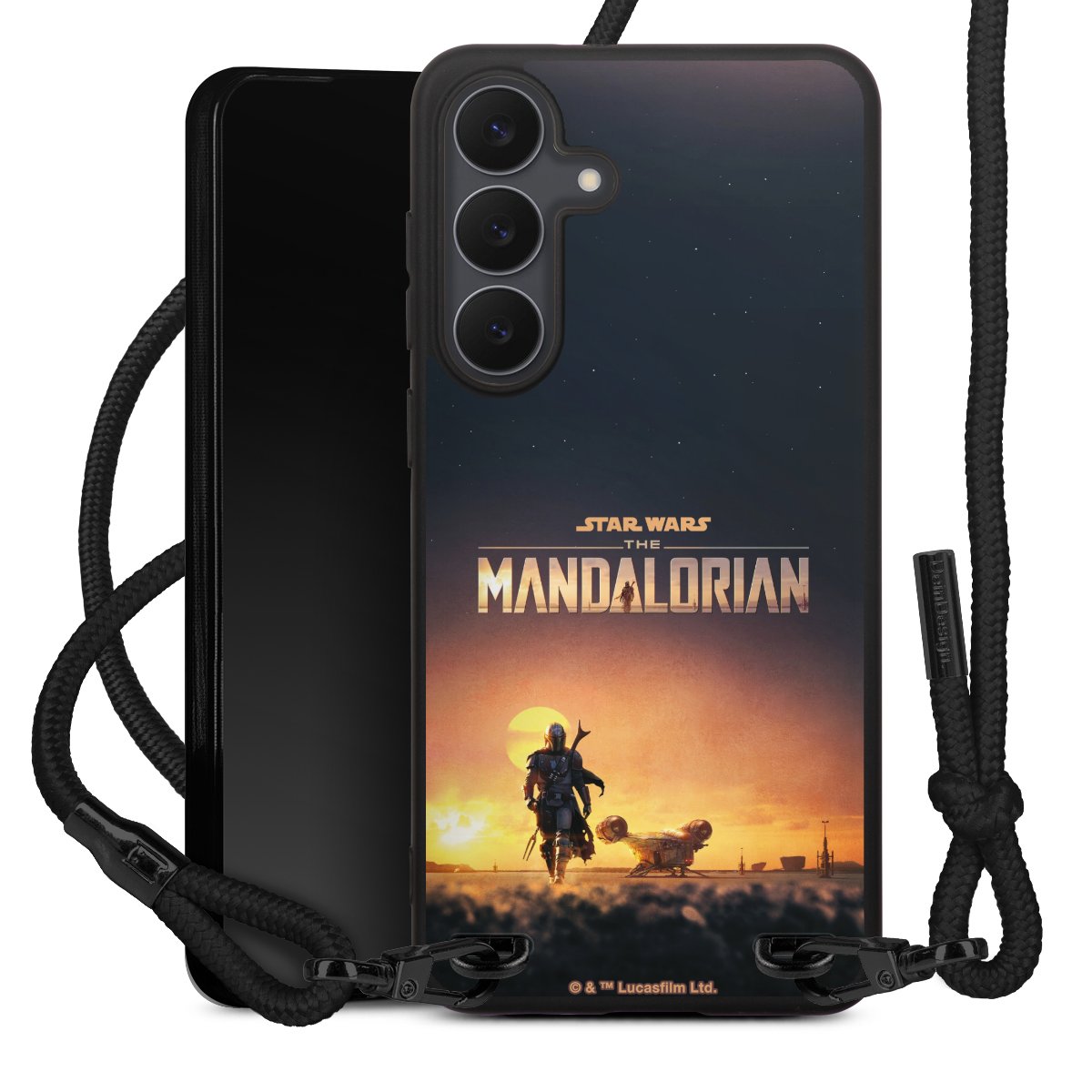Pure Black: Handyhülle, Stoffband und Metalldetails in stylischem Mattschwarz.