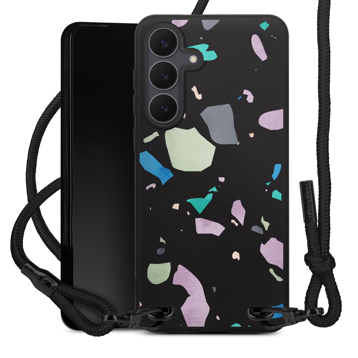 Pure Black: Handyhülle, Stoffband und Metalldetails in stylischem Mattschwarz.