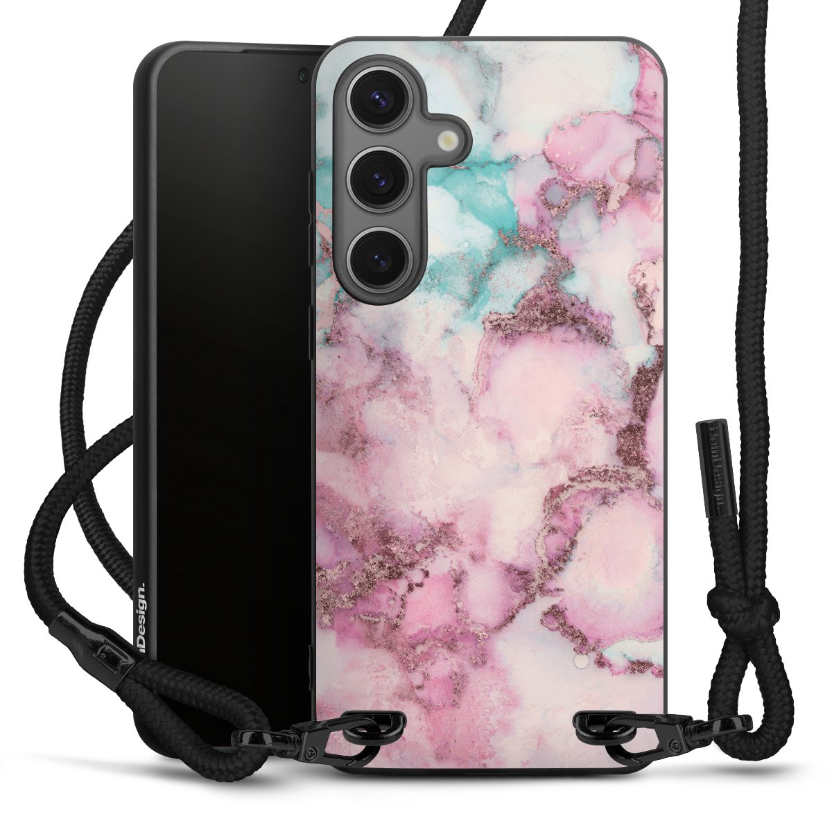 Pure Black: Handyhülle, Stoffband und Metalldetails in stylischem Mattschwarz.