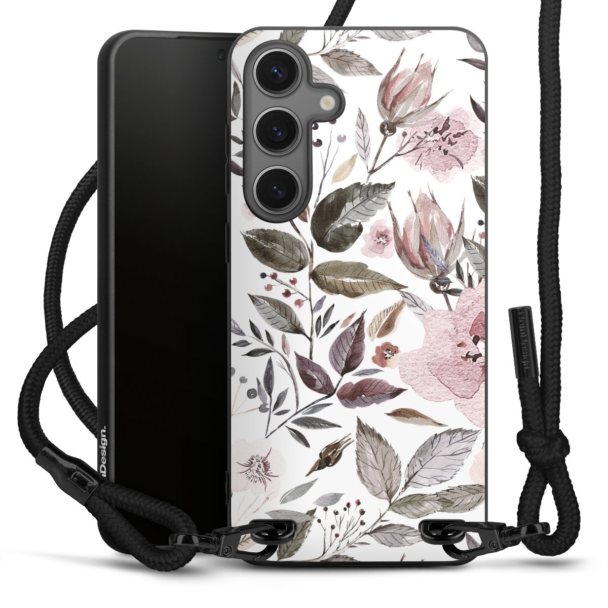 Pure Black: Handyhülle, Stoffband und Metalldetails in stylischem Mattschwarz.