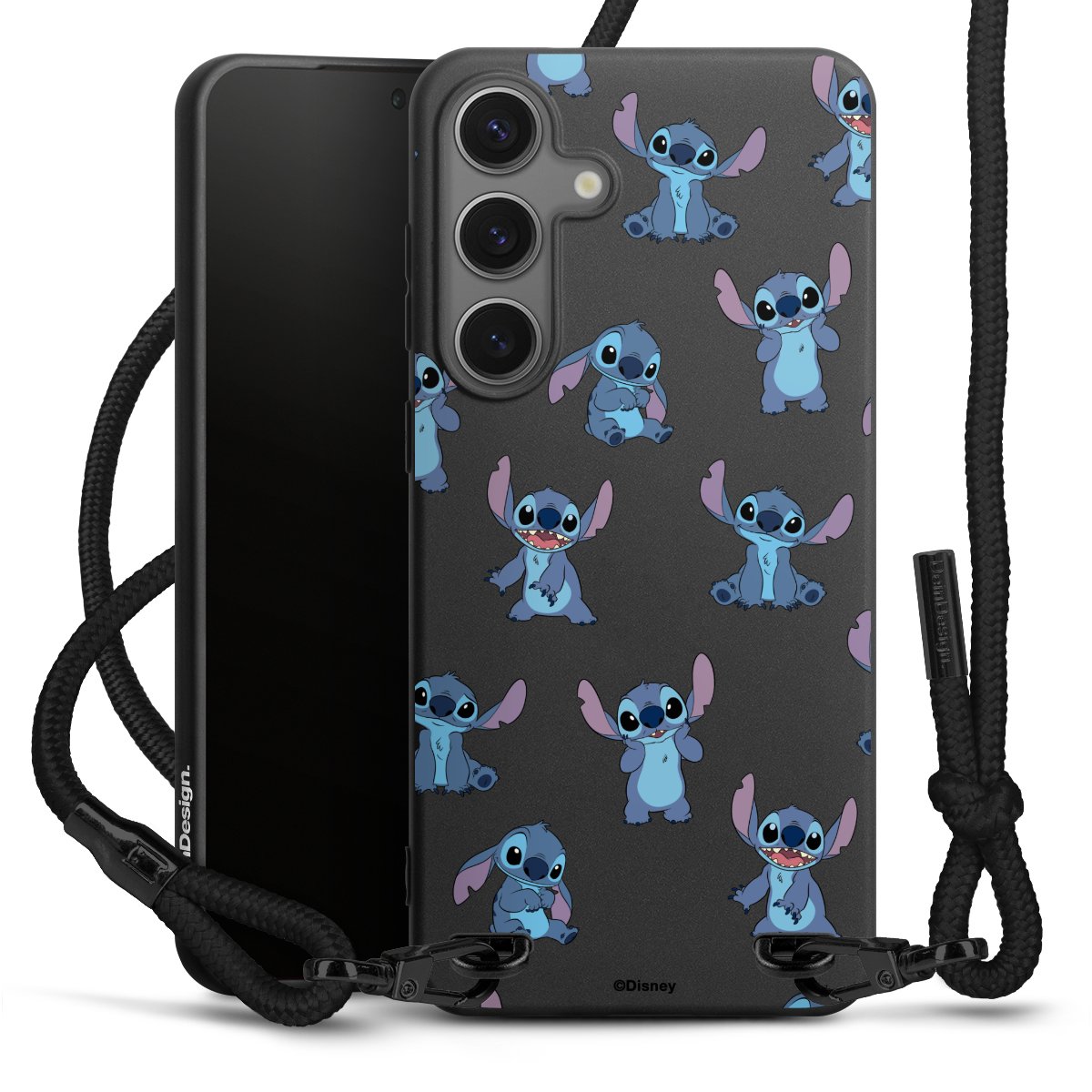 Pure Black: Handyhülle, Stoffband und Metalldetails in stylischem Mattschwarz.