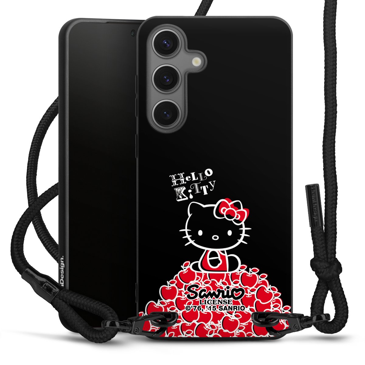 Pure Black: Handyhülle, Stoffband und Metalldetails in stylischem Mattschwarz.