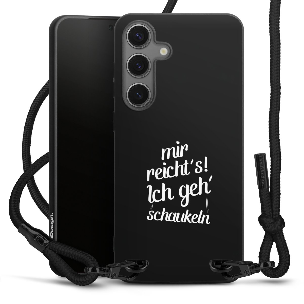 Pure Black: Handyhülle, Stoffband und Metalldetails in stylischem Mattschwarz.