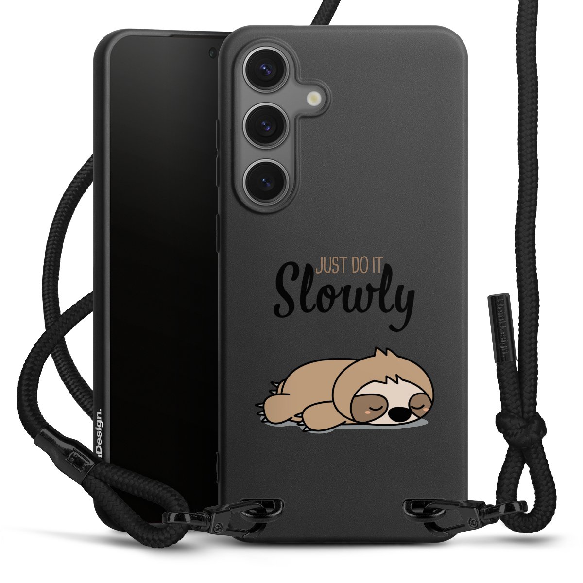 Pure Black: Handyhülle, Stoffband und Metalldetails in stylischem Mattschwarz.