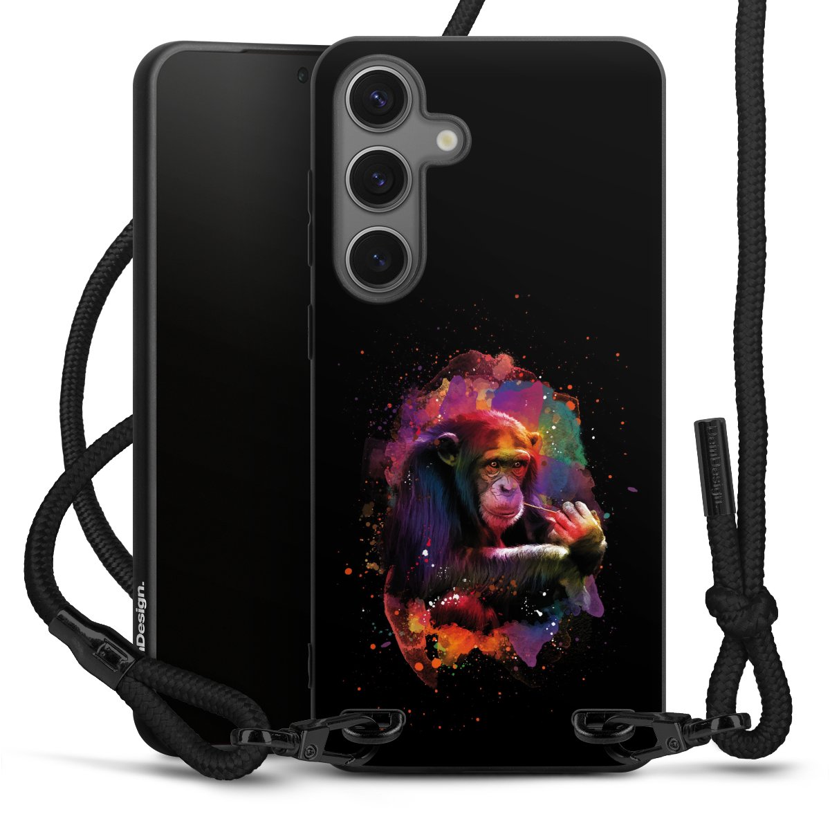 Pure Black: Handyhülle, Stoffband und Metalldetails in stylischem Mattschwarz.