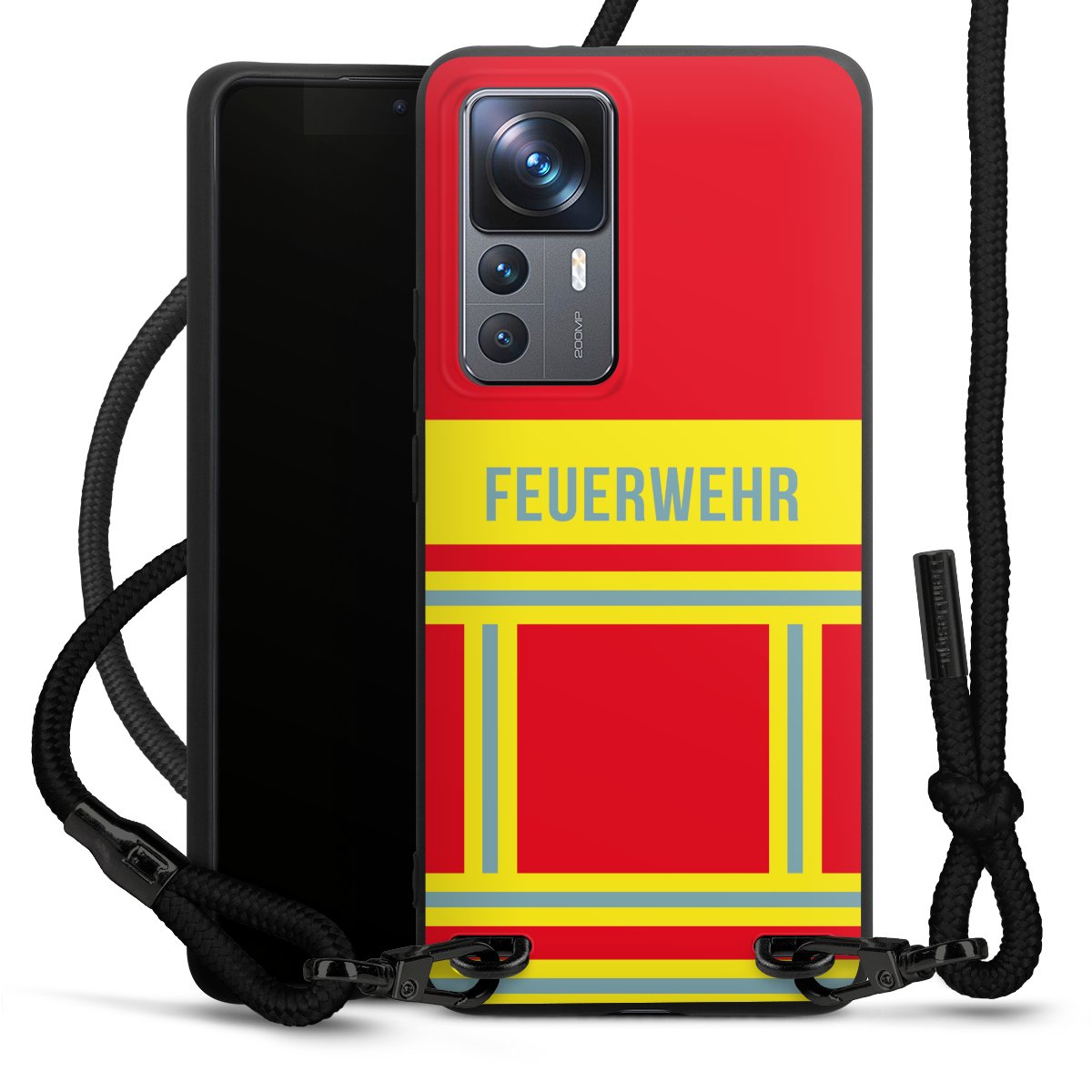 Pure Black: Handyhülle, Stoffband und Metalldetails in stylischem Mattschwarz.