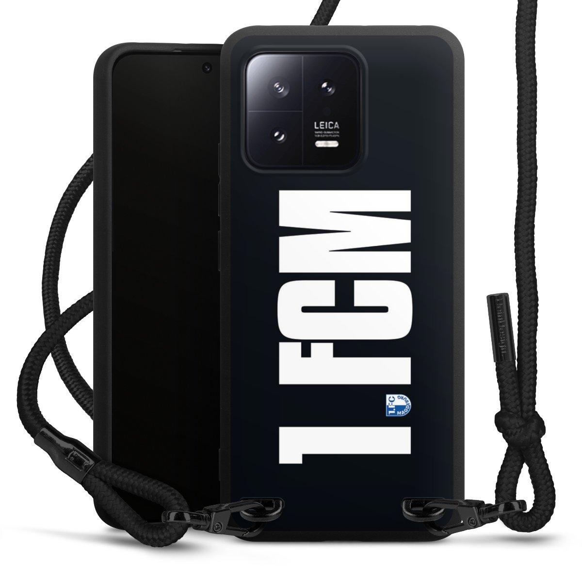 Pure Black: Handyhülle, Stoffband und Metalldetails in stylischem Mattschwarz.