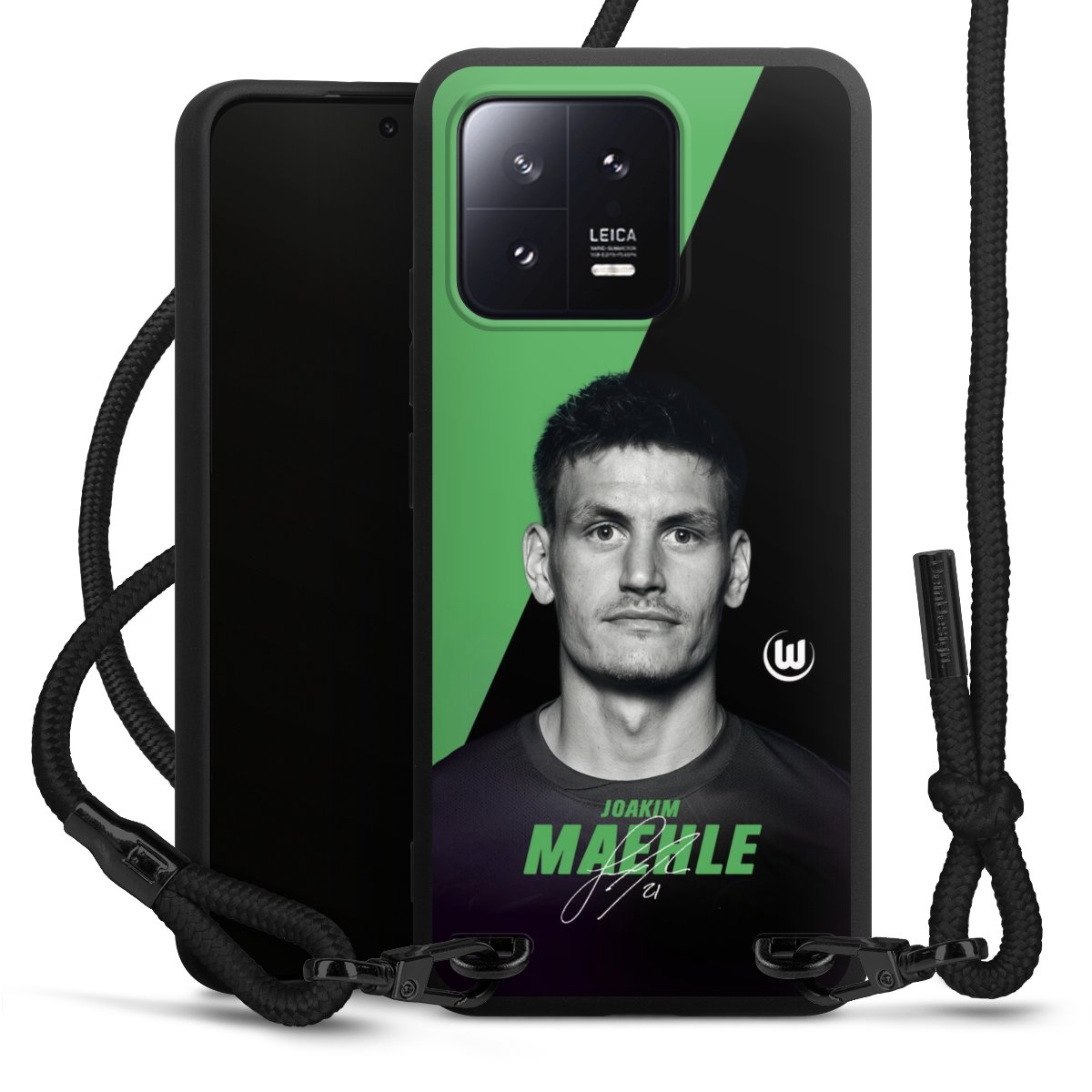 Pure Black: Handyhülle, Stoffband und Metalldetails in stylischem Mattschwarz.