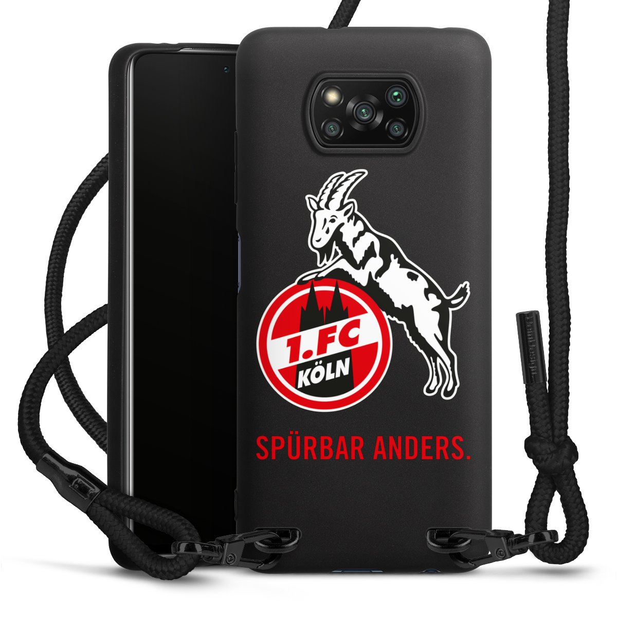 Pure Black: Handyhülle, Stoffband und Metalldetails in stylischem Mattschwarz.