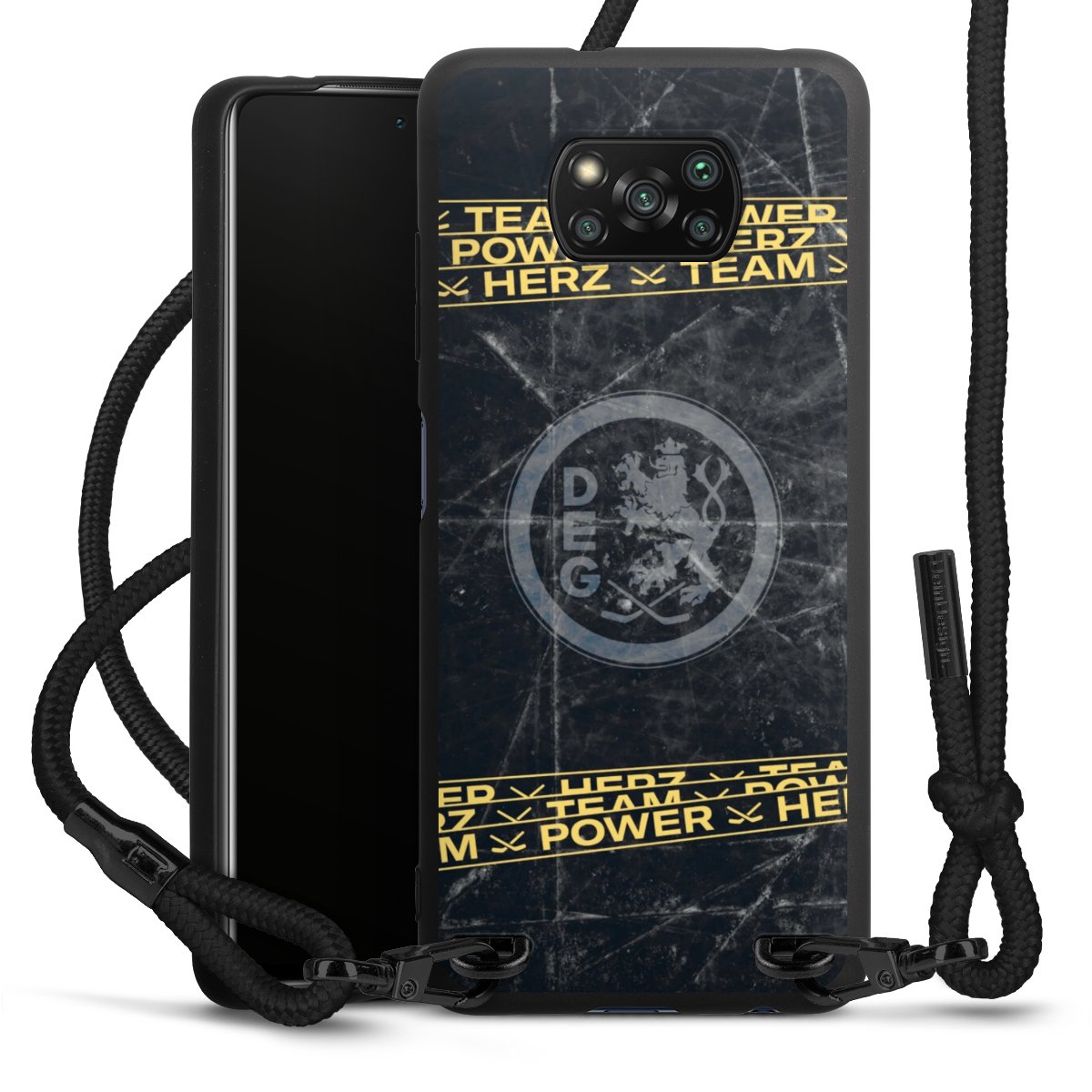 Pure Black: Handyhülle, Stoffband und Metalldetails in stylischem Mattschwarz.
