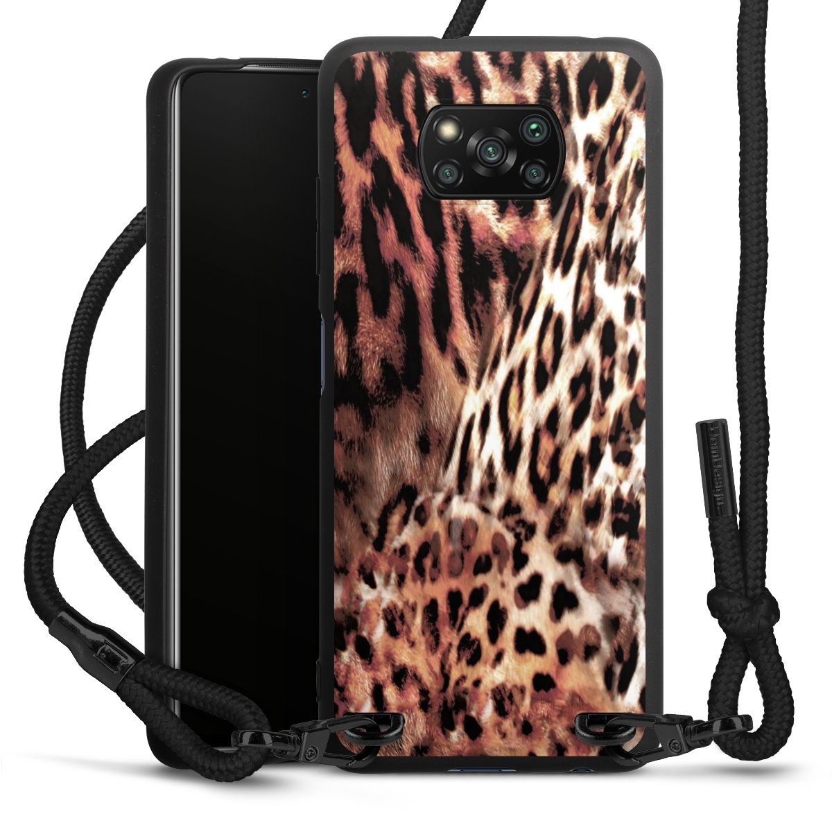 Pure Black: Handyhülle, Stoffband und Metalldetails in stylischem Mattschwarz.