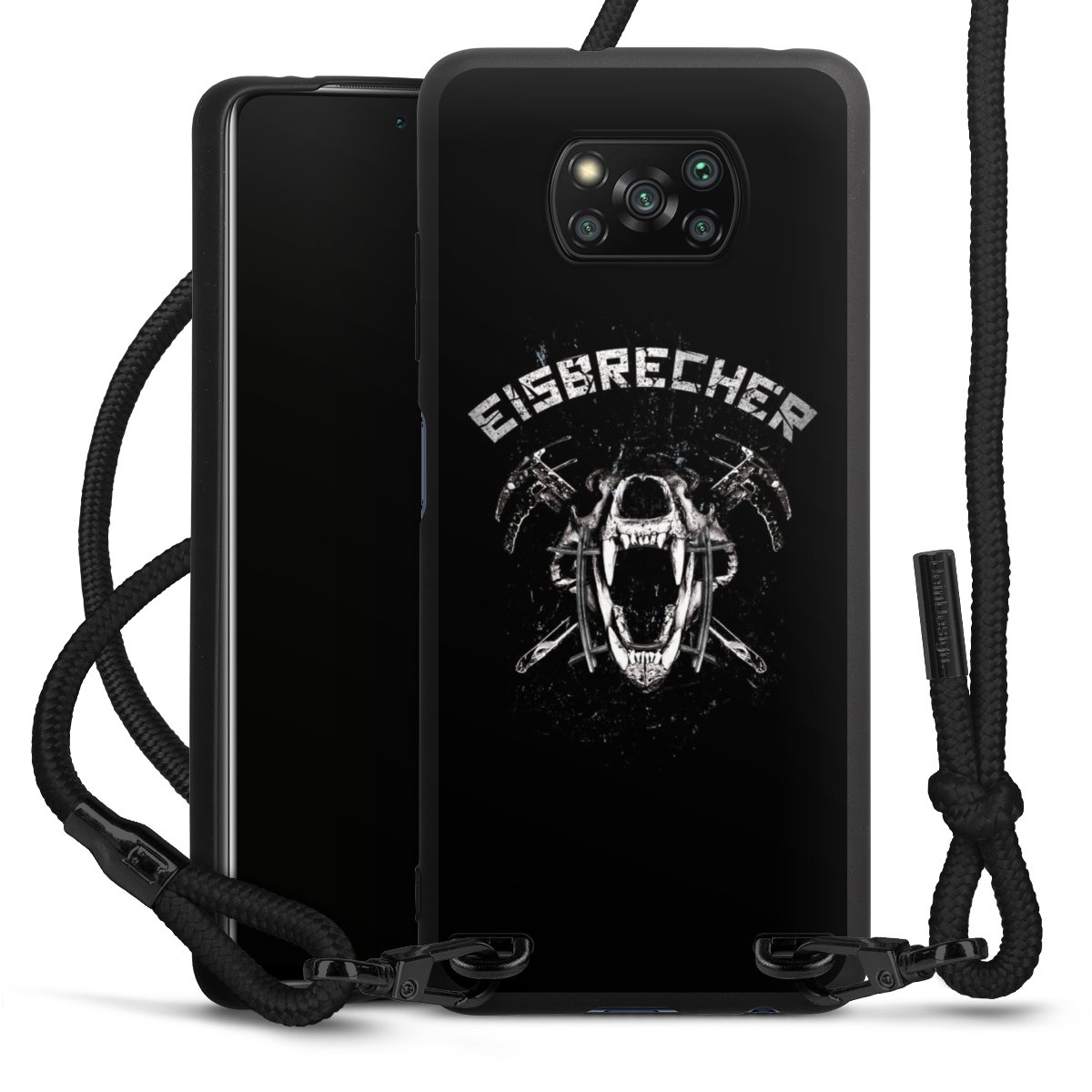 Pure Black: Handyhülle, Stoffband und Metalldetails in stylischem Mattschwarz.