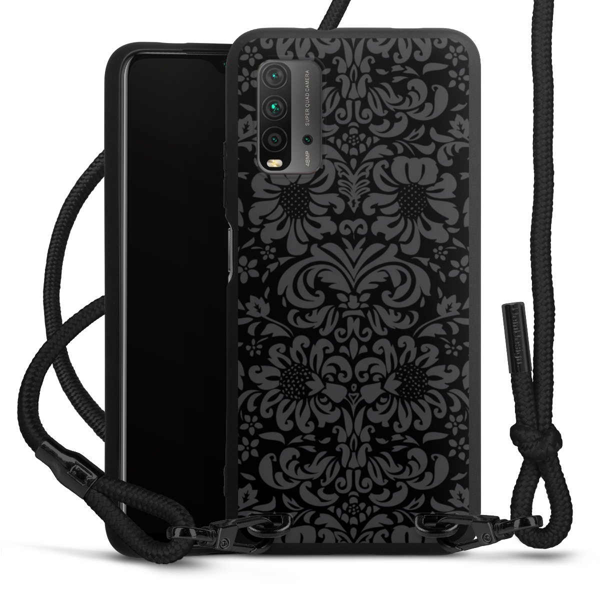 Pure Black: Handyhülle, Stoffband und Metalldetails in stylischem Mattschwarz.