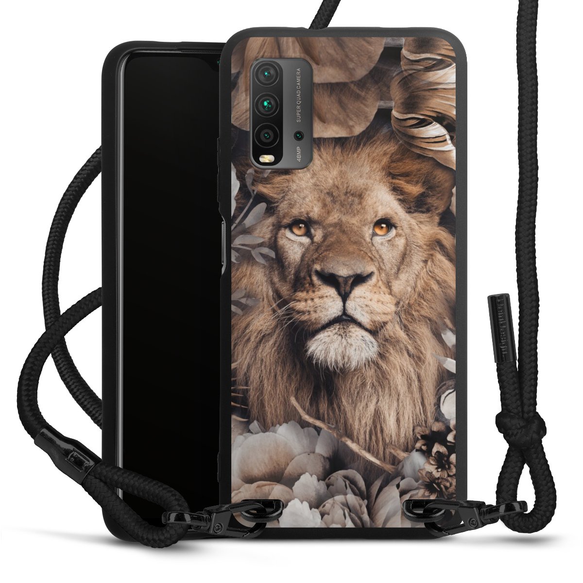 Pure Black: Handyhülle, Stoffband und Metalldetails in stylischem Mattschwarz.