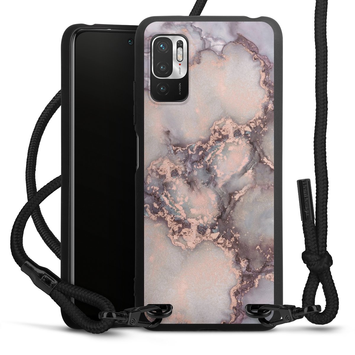 Pure Black: Handyhülle, Stoffband und Metalldetails in stylischem Mattschwarz.
