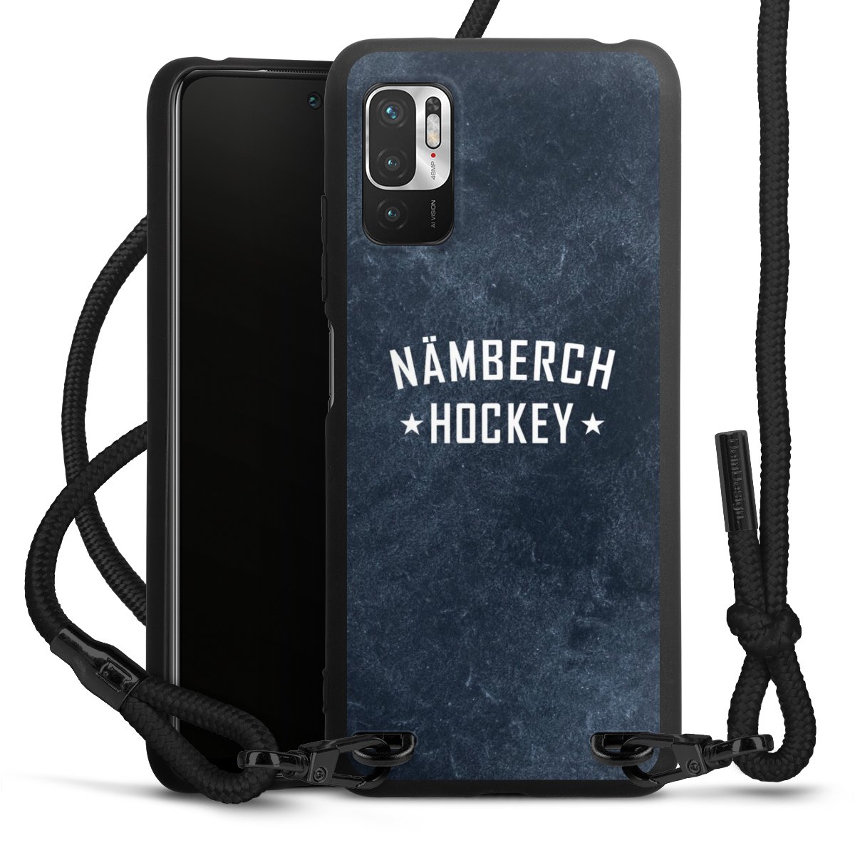 Pure Black: Handyhülle, Stoffband und Metalldetails in stylischem Mattschwarz.