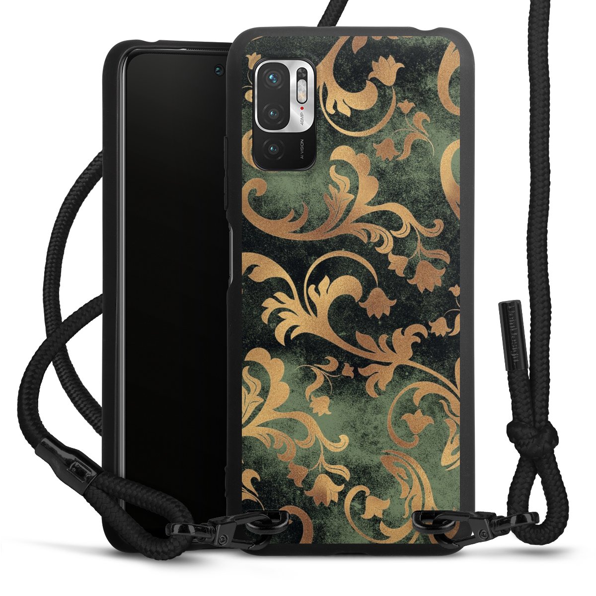 Pure Black: Handyhülle, Stoffband und Metalldetails in stylischem Mattschwarz.