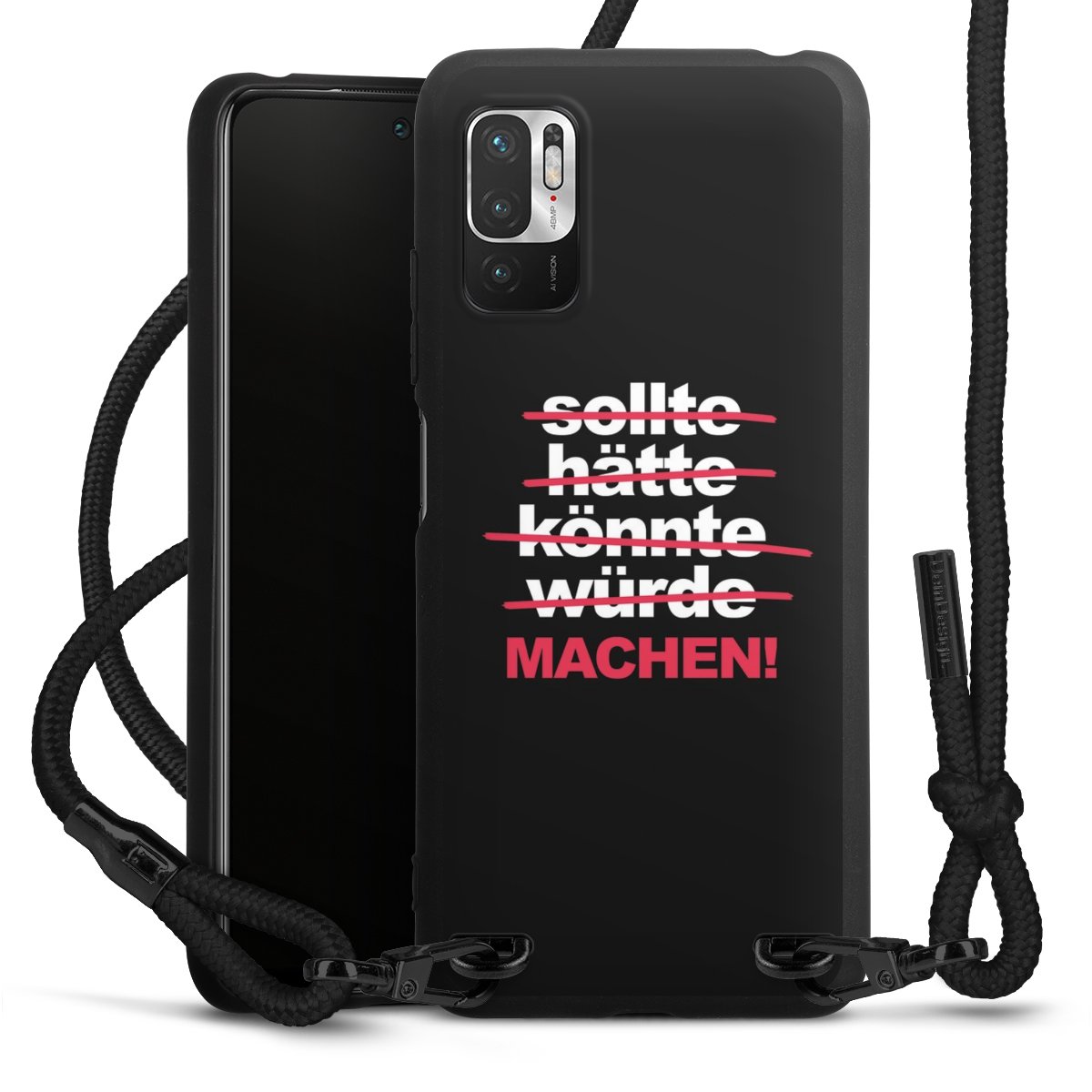 Pure Black: Handyhülle, Stoffband und Metalldetails in stylischem Mattschwarz.