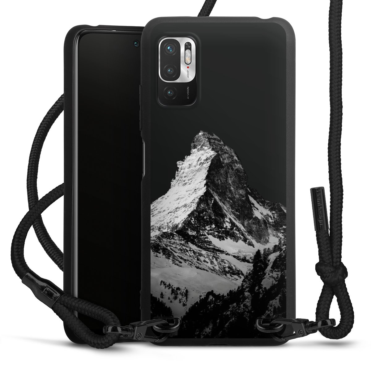 Pure Black: Handyhülle, Stoffband und Metalldetails in stylischem Mattschwarz.