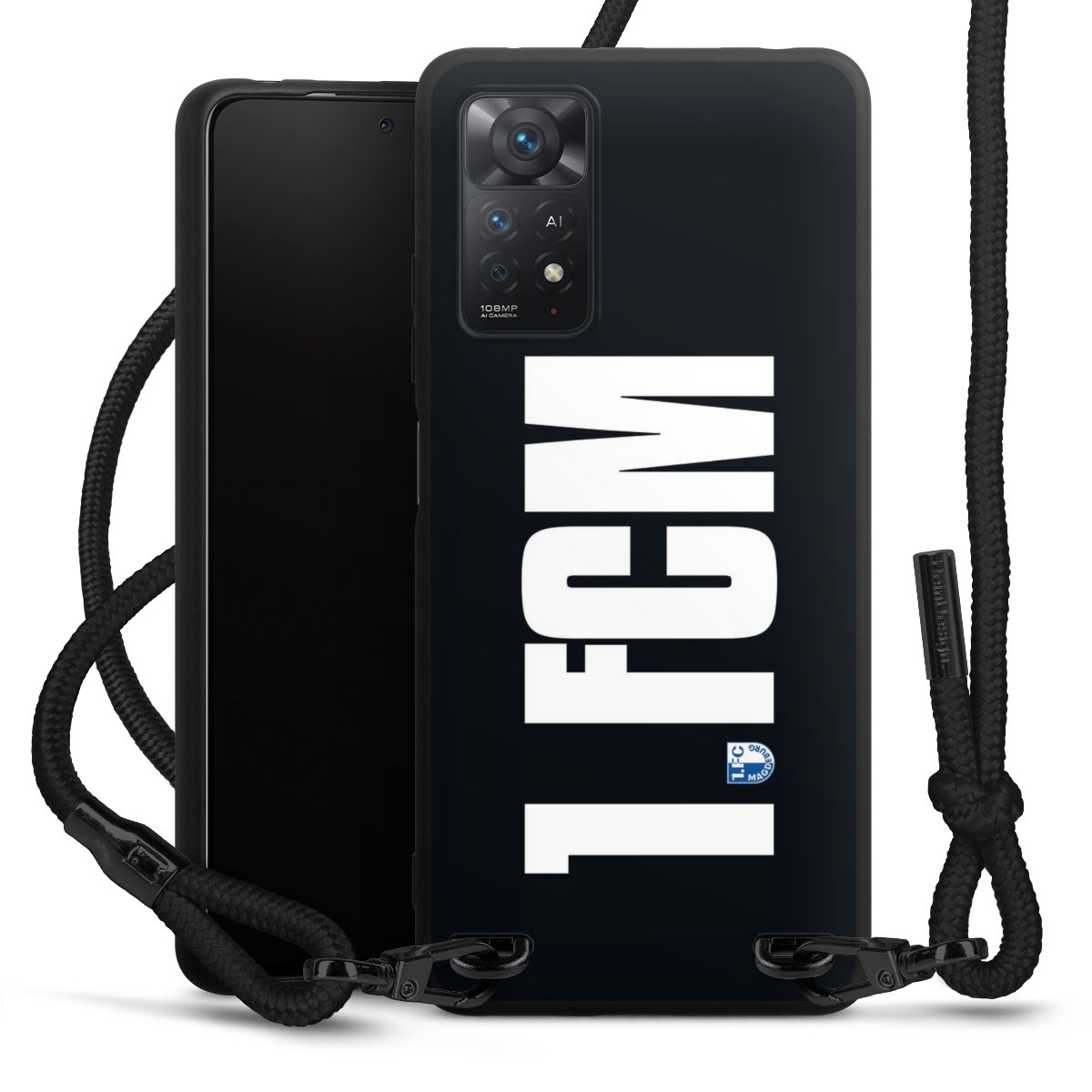 Pure Black: Handyhülle, Stoffband und Metalldetails in stylischem Mattschwarz.