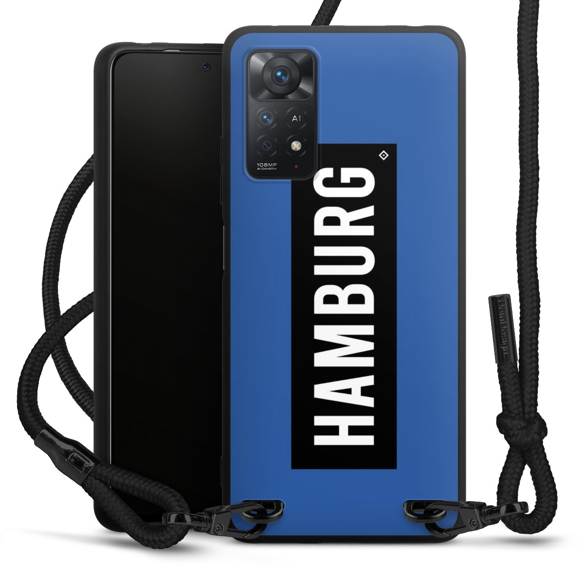 Pure Black: Handyhülle, Stoffband und Metalldetails in stylischem Mattschwarz.